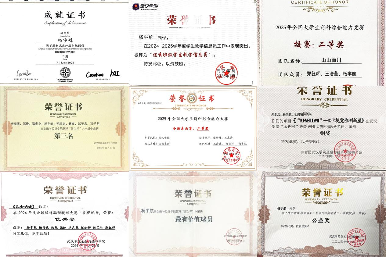 【人物名片】杨宇航,国际经济与贸易2401班班长,金融与经济学院院级信息员,经济学社国贸跨电分社部长。2024—2025学年期末成绩平均分85分以上,位于专业前列。除学习课堂知识以外,他积极投身校园活动,获活动证明20余次。在竞赛方面表现较为出色,荣获1次国家级二等奖、创新创业省级立项成员、3次校级奖项及多次院级奖项。作为班委,他积极发挥引领带头作用组织班级各项活动,增强班级凝聚力。
