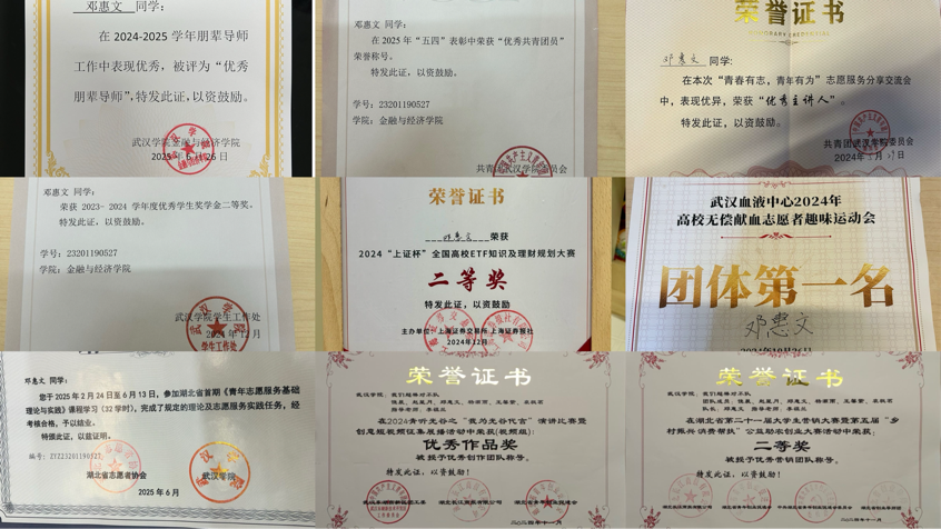 在专业学习方面,邓惠文脚踏实地,勤勉刻苦。尽管身兼多职,她始终将学习放在首位,注重课堂效率,善于与老师互动交流,在专业课程中始终保持优异的学习成绩。同时,她积极参加各类竞赛,与团队共同参与"上证杯"全国理财规划大赛荣获全国二等奖,参与大学生创新创业训练计划项目获省级立项和校级立项,在"天翼云杯"湖北省大学生营销策划挑战赛中获校赛三等奖。此外,还参与湖北省"乡村振兴消费帮扶"公益助农创业大赛并获得二等奖。从最初对比赛流程的陌生,到如今能够熟练参与项目运作,她的创新项目从初步构想到最终获得多项奖项,展现出卓越的创新能力与实践能力。