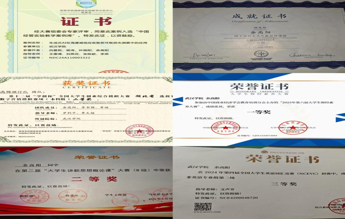 【人物名片】余高阳,国际经济与贸易2301班学习委员,国际经济与贸易2501班朋辈导师、学院第五期“青马班”成员及校级科研团队成员。2024-2025学年必修课成绩平均分92.3,班级排名第一,位列专业第一,荣获武汉学院“优秀学生一等奖”。曾获金融与经济学院“金融之星”“学习标兵”“优秀教学信息员”等荣誉称号。获得国家英语四级、六级证书,学习之余积极参加学科竞赛和校内外志愿服务与公益活动,获2项国家级奖项、3项省级奖项及多项校级奖项,以第一作者发表论文一篇。