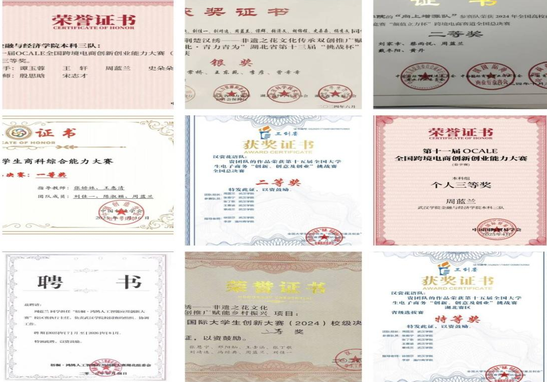 【人物名片】周蓝兰,共青团员,国际经济与贸易2201班宣传委员。学年班级综合测评排名1/55,获评“优秀学生一等奖”“优秀学生二等奖”“校艺术团优秀干事”等荣誉。持有中级跨境电子商务师、技术经理人职业资格证书。竞赛领域成果丰硕,2025年累计斩获5项国家级奖项、3项省级奖项、3项校级奖项;科研实践方面,以骨干成员身份参与老师的科研课题,拥有2项计算机软件著作权,撰写1篇学术论文。职场实践中,在中国黄金湖北总店(央企)实践期间,凭突出业绩破格进入企业人才储备系统;现在武汉中科超级云计算有限公司(央企)实习,同时兼任梧桐杯竞赛武汉学院区执行主任,高效搭建校园与央企竞赛对接桥梁。