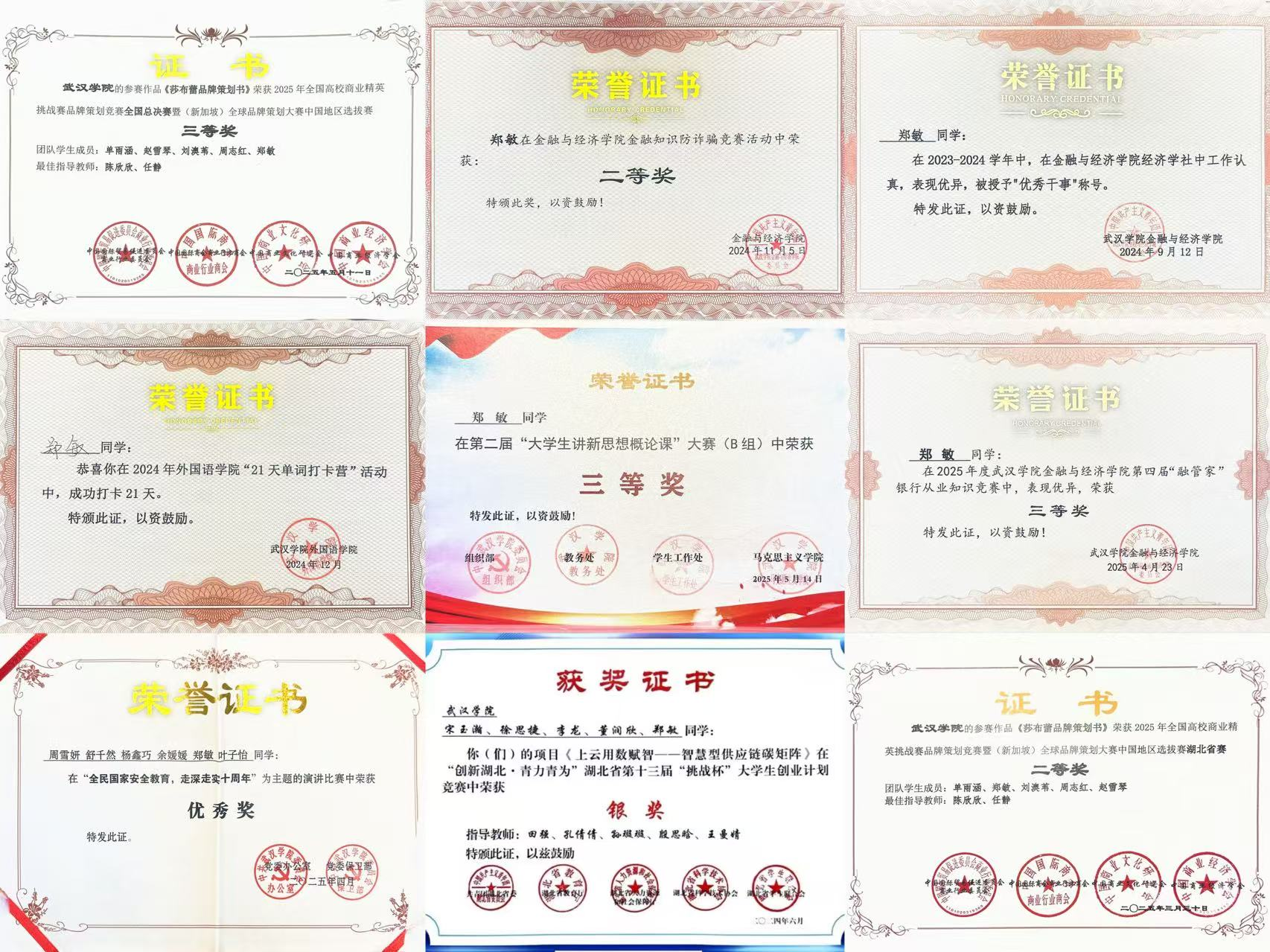 【个人名片】郑敏,金融与经济学院税收学 2302 班学生,现任学院经济学社社长。她始终以“德才兼备、全面发展”为目标,在思想铸魂、学业深耕、实践赋能、服务引领等方面均表现突出,大学至今绩点4.02,均分90.32,先后荣获学校优秀学生二等奖学金、优秀共青团员称号,斩获全国高校商业精英挑战赛品牌策划竞赛三等奖、大学生创新创业训练项目省级立项、“挑战杯”全国大学生竞赛湖北省银奖等多项荣誉,累计志愿服务时长超 209小时,是兼具思想高度、专业深度与实践温度的新时代大学生典范。