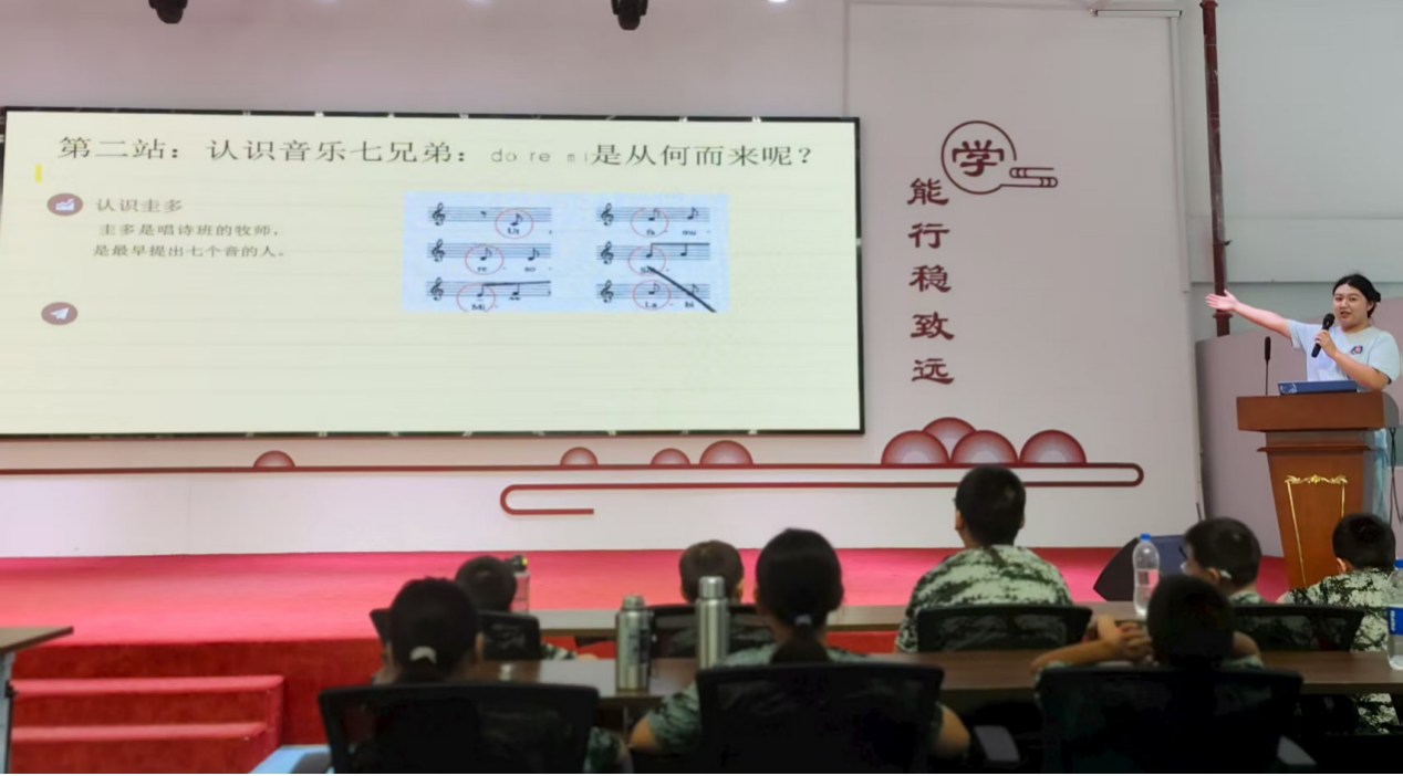 音乐课上,舒千然以“认识音乐小精灵”为主题,用生动形象的比喻将音符和五线谱知识融入课堂。她通过趣味问答和互动游戏,引导孩子们认识全音符、四分音符等基本音符的形状与节拍,还借助手绘的五线谱图,教大家辨别音符的位置。“这个像小蝌蚪的是四分音符,它唱一拍哦!”她耐心讲解,孩子们瞪大好奇的眼睛,跟着节奏拍手练习,课堂里满是欢快的歌声与笑声。