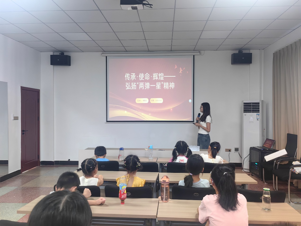 为在少年儿童心中厚植爱国情怀,传承红色基因,弘扬“热爱祖国、无私奉献,自力更生、艰苦奋斗,大力协同、勇于登攀”的“两弹一星”精神,2025年8月16日,武汉学院金融与经济学院青年宣讲团成员郑雅文走进西关街社区,为社区的小朋友们带来了一场别开生面、充满童趣的“传承·使命·辉煌——弘扬‘两弹一星’精神”主题宣讲活动。此次活动旨在用孩子们听得懂、喜欢听的方式,讲述科学家的故事,点燃他们的科学梦想和爱国热情。