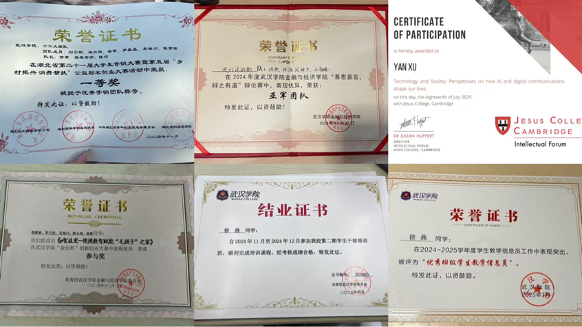 徐燕坚信“实践出真知”,她积极投身各类学科竞赛与创新创业活动,在实战中提升专业能力与综合素质。从营销策划到跨境电商运营,从辩论赛场到计算机设计舞台,她不断挑战自我,屡创佳绩。她勇敢迈出第一步,在竞赛中收获友谊、知识与自信。除了专注学业与竞赛,她也注重综合素质的提升。积极参与英语角互动,锻炼口语与表达能力;参加学生干部培训,提升组织协调能力;完成剑桥大学全球素养工作坊,拓展国际视野。她认为,“大学不仅是知识的殿堂,更是人格塑造和能力锻炼的舞台。只有不断尝试、不断突破,才能遇见更好的自己。”