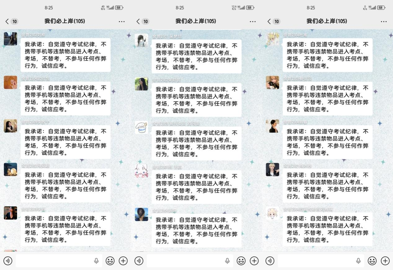 会议尾声,辅导员发起诚信应考承诺倡议,要求全体同学会后在班级群统一回复承诺内容。同学们积极响应,依次在群内发送:我承诺:自觉遵守考试纪律,不携带手机等违禁物品进入考点、考场,不替考,不参与任何作弊行为,诚信应考。 一句句郑重承诺,彰显了同学们坚守诚信、拒绝舞弊的坚定决心,将诚信意识转化为行动自觉