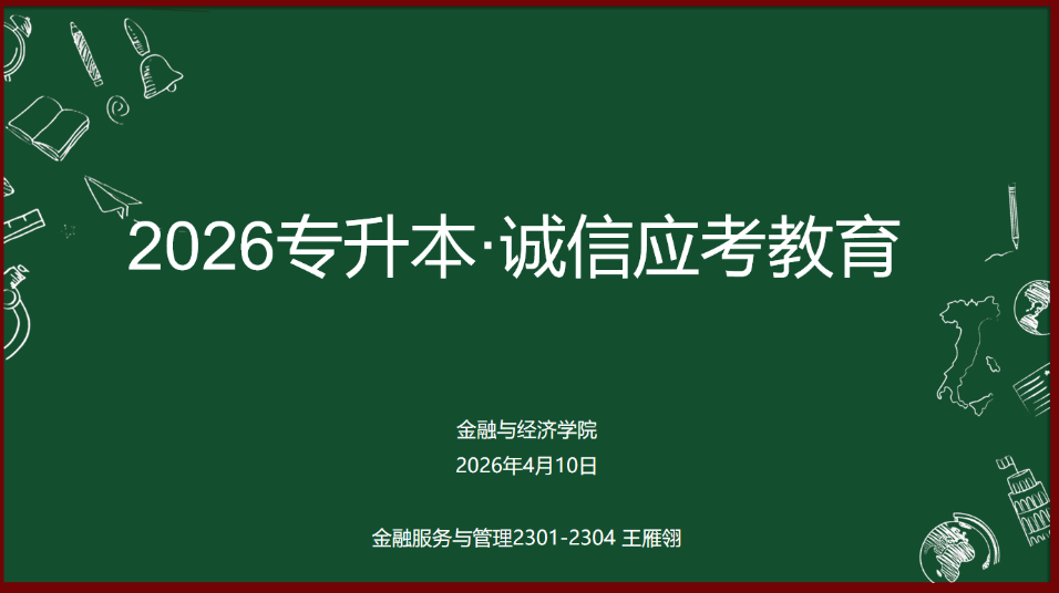 为严肃考风考纪,筑牢诚信考试思想防线,保障2026年专升本考试平稳有序进行,2026年4月10日晚八点,我院通过腾讯会议召开金融服务与管理2301-2304班专升本诚信考试线上专题会议。全体专升本考生准时参会、认真聆听,会议由辅导员王雁翎主持开展。