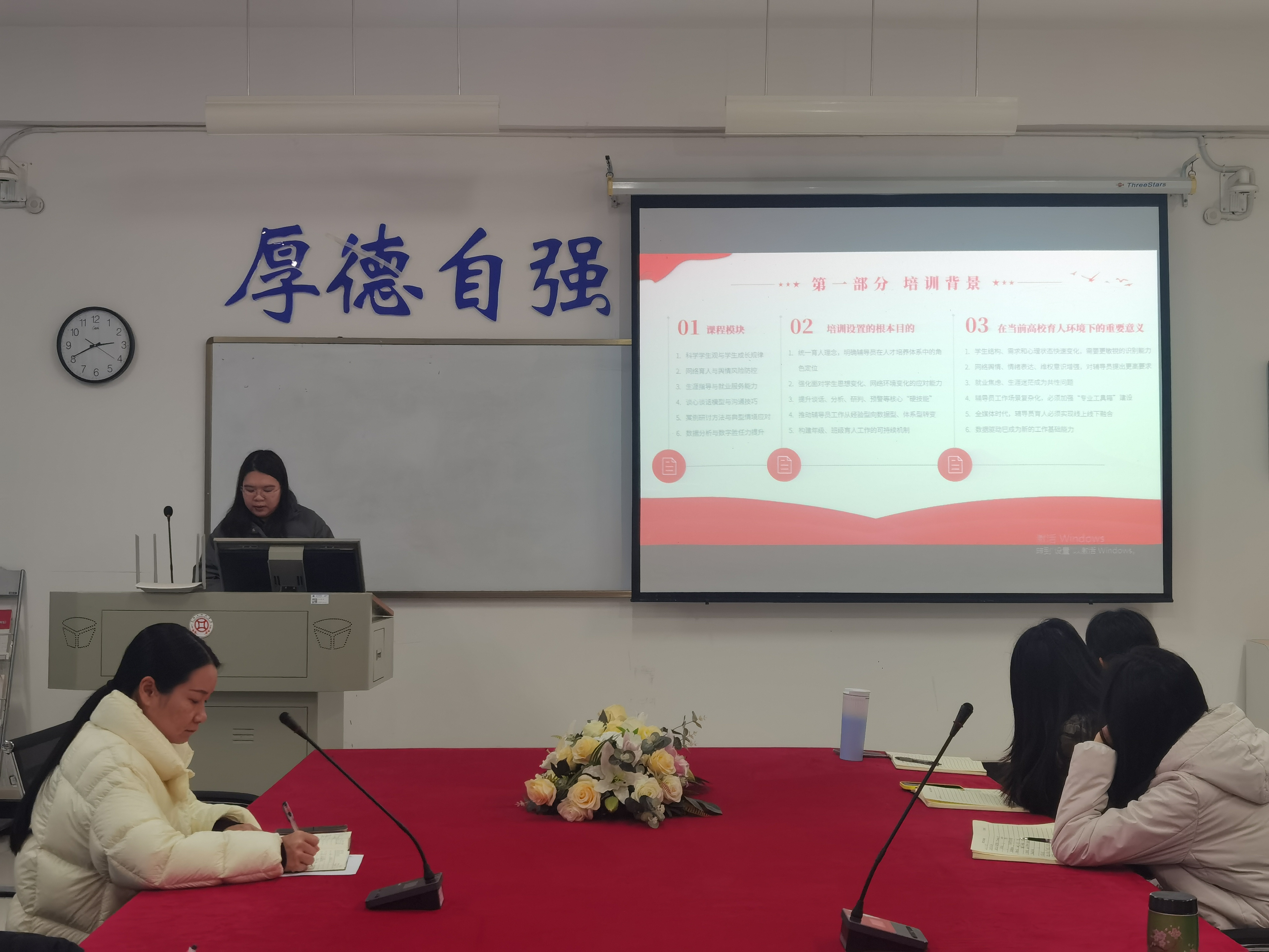 王雁翎结合在中国地质大学为期三天的集中培训所学,围绕当前高校育人环境变化与辅导员工作核心需求,以“政治站位、角色重塑、学生识别、网络育人、生涯指导、职业心态”六大关键词为核心展开分享。培训伊始,她强调了此次外出培训的核心目标——掌握可落地、可操作、可复制的育人方法,应对学生结构、心理状态、信息获取方式快速变化带来的挑战,以及网络情绪、就业焦虑、维权意识增强等多重压力下的工作新要求。