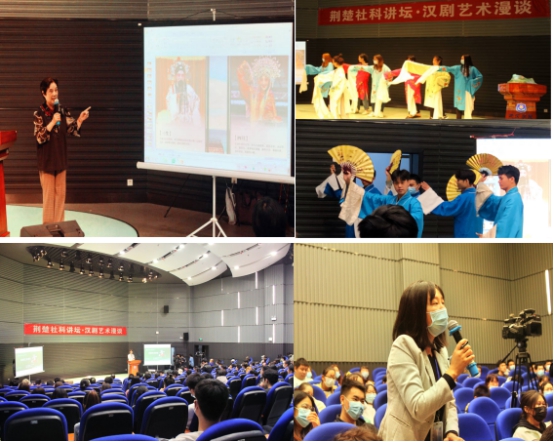 座谈会结束后,著名汉剧演员、汉剧花旦名家、武汉市非物质文化遗产传承人袁忠玉先生为武汉学院的学子做了“汉剧艺术漫谈”的讲座。金融与经济学院近200余名师生参加了讲座。汉剧花旦名家袁忠玉现场示范“唱念做打”,传授戏曲演员练就灵动眼神和优雅身姿的秘诀。