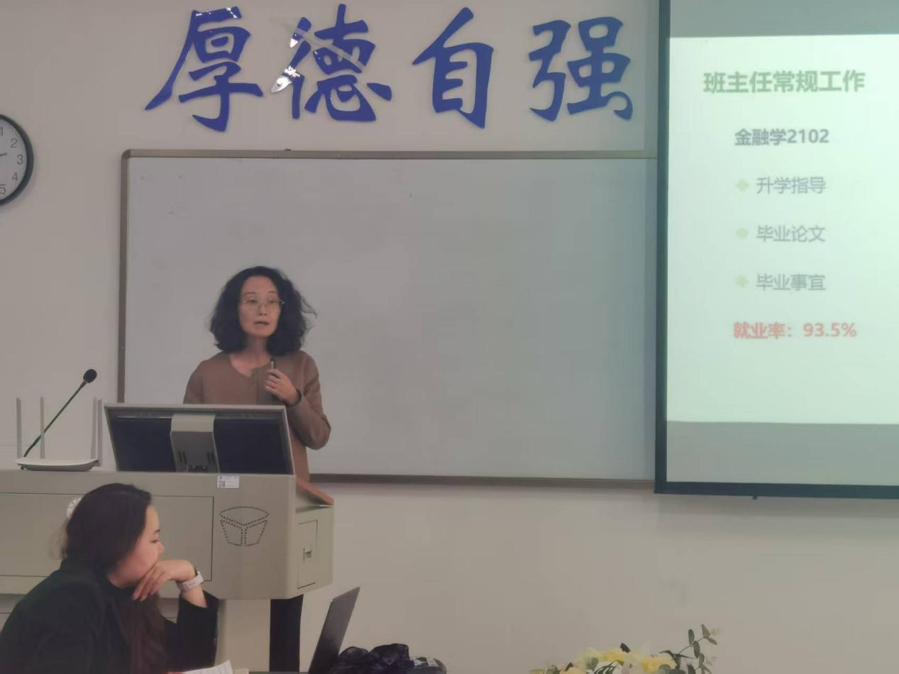 会上,金融系阮丹老师结合所带班级实际情况,围绕升学指导、毕业论文、学业帮扶、生活关怀等方面,分享了工作方法与技巧,结合具体案例,强调身教大于言传,指出了自己“因‘班’而异,因‘时’而动”的工作感悟。