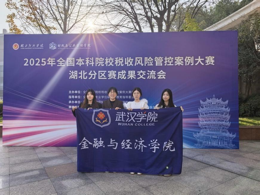 11月15日上午,李嘉悦、何奕莹、柏傲雪同学和指导老师侯晓受邀到湖北经济学院参加2025年全国本科院校税收风险管控案例大赛湖北省分赛区成果交流会,与武汉大学、华中科技大学、中南财经政法大学、武汉纺织大学、湖北经济学院、武汉商学院等高校财税专业学生共同分享参赛感悟。