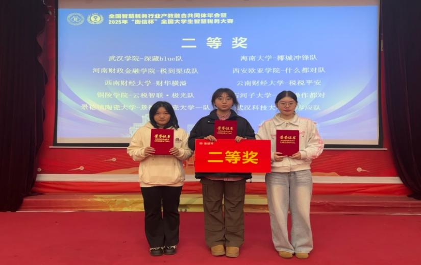 11月29日,2025年第十一届“衡信杯”全国大学生智慧税务大赛全国总决赛在江西财经大学收官。金融与经济学院由税收学2302班汪悦担任队长,胡梦元、梁思雅为队员的参赛团队,在李凌、侯晓两位老师的专业指导下,历经校内赛、省赛层层筛选,最终与西南财经大学、江西财经大学、河北经贸大学、武汉科技大学、海南大学、重庆理工大学等高校队伍同台竞技,从全国本科组98支晋级队伍中突围,荣获国家级二等奖。