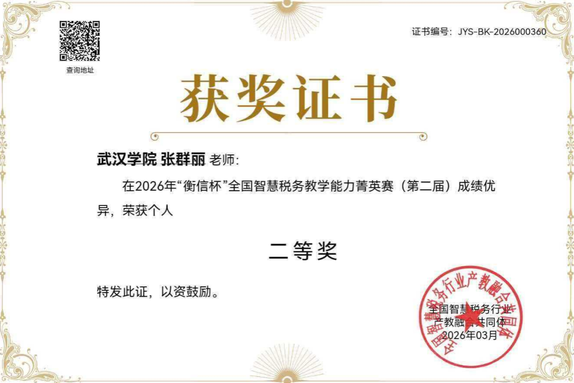 近日,2026年“衡信杯”全国智慧税务教学能力菁英赛(第二届)圆满落幕,武汉学院金融与经济学院财税系参赛教师侯晓、张群丽、李凌表现优秀,从全国800余所院校的2000余名参赛选手中脱颖而出,斩获个人总分奖一等奖1项、二等奖1项、三等奖1项,并凭借团队整体优异表现荣获团队二等奖,实现了个人荣誉与集体荣誉的双丰收,充分展现了我校财税专业教师扎实的专业功底与卓越的教学实践能力。