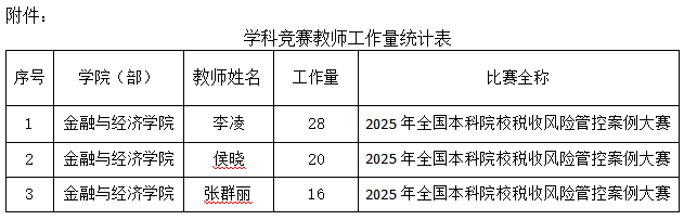 经过认真组织和积极备赛,由湖北经济学院作为竞赛承办单位的2025年全国本科院校税收风险管控案例大赛湖北省分区赛圆满结束,根据《武汉学院大学生学科竞赛管理办法(暂行)》(武院政〔2022〕14号)文件规定,现将竞赛教师指导工作量分配结果予以公示,公示期为2025年11月21日至2025年11月25日。公示期内如有异议,请以书面形式向学院反映,并提供异议的事实依据(包括必要的证明材料)。