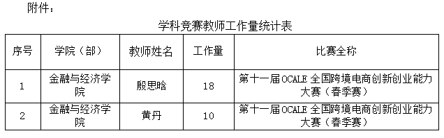 经过认真组织和积极备赛,由我院作为竞赛承办单位的第十一届OCALE全国跨境电商创新创业能力大赛(春季赛)圆满结束,根据《武汉学院大学生学科竞赛管理办法(暂行)》(武院政〔2022〕14号)文件规定,现将竞赛教师指导工作量分配结果予以公示,公示期为2025年12月12日至2025年12月14日(公示期三天)。公示期内如有异议,请以书面形式向学院反映,并提供异议的事实依据(包括必要的证明材料)。