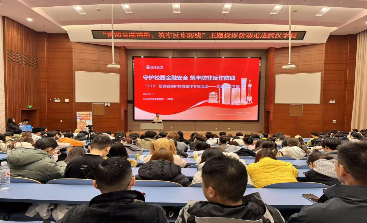 2026年3月15日晚18时,正值国际消费者权益日,由长江证券投资者教育基地主办的“清朗金融网络 守护安心投资”主题投保活动在我校中2103报告厅顺利举行。本次活动特邀长江证券两位专家担任主讲,金融学专业2025级全体学生到场学习,现场气氛热烈。