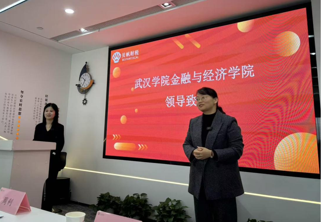 随后,双方正式开展“武汉学院金融经济学院莅临贝帆财税走访交流”会议。贝帆财税的创始人史承艳女士致欢迎词,介绍了贝帆财税的发展愿景,与武汉学院的渊源,并表达了对武汉学院人才培养成果的认可和对老师们的到来表示欢迎。随后贝帆财税人事行政经理罗良慧子对公司的发展目标、发展历程、商业模式、人才建设发展计划等进行了详细的介绍。金融与经济学院副院长周利表达了对贝帆财税的感谢,并对武汉学院人才培养理念和定位进行了介绍,阐述了双方合作建立的基础和必然性,对贝帆财税和校友未来的发展表达了祝福。