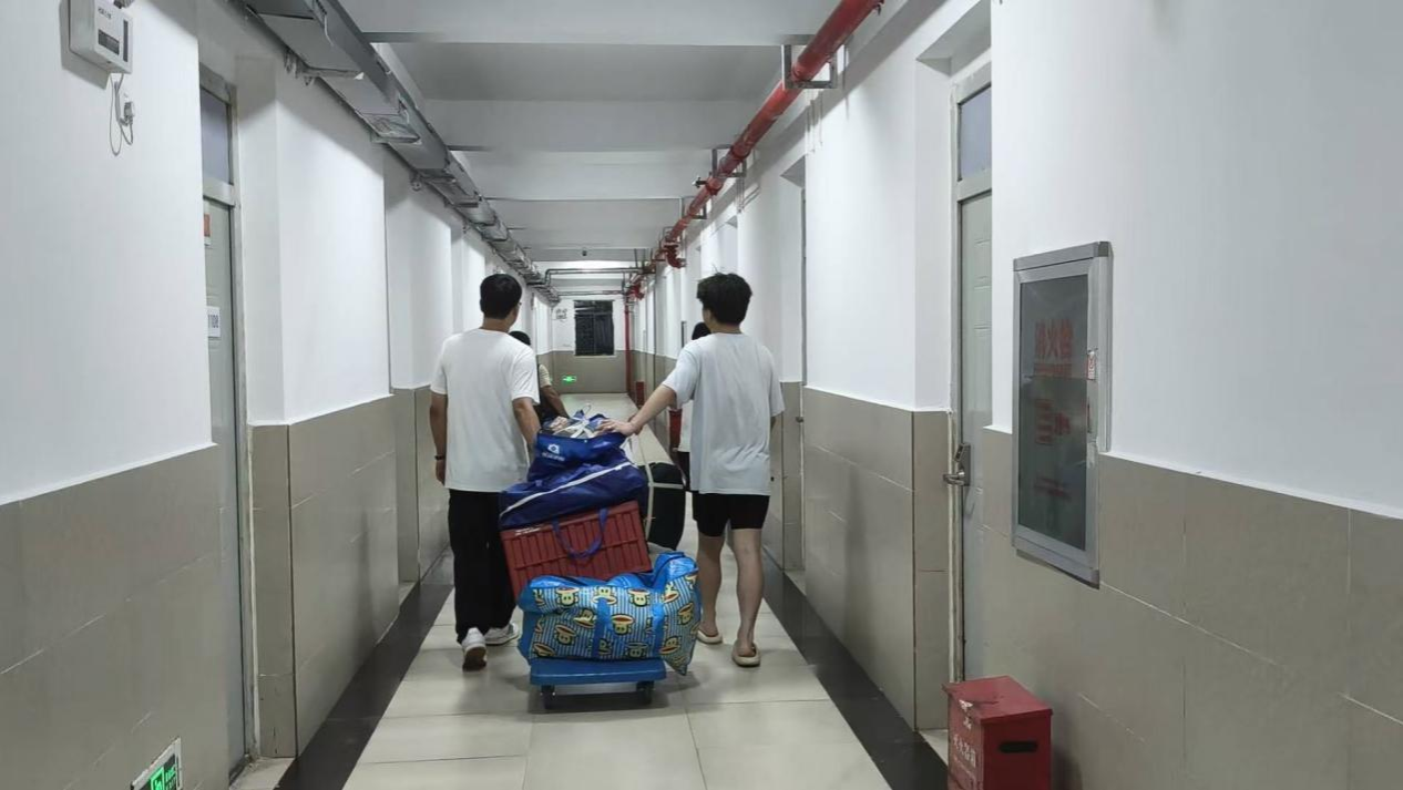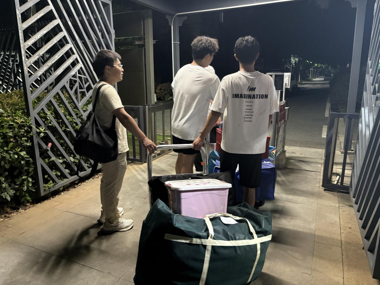 搬迁首日下午,周然提前抵达现场统筹规划,将6个班级志愿者划分为两个协作单元,两个单元由解睿和吴逍遥担任组长,负责协调物资搬运、路线引导和应急保障。面对宿舍楼间距较远、大型物品转运困难等挑战,他们带领志愿者逐层排查受困学生,开辟临时物品堆放区,并协调学院调配平板推车9辆,为搬迁工作筑牢安全防线。