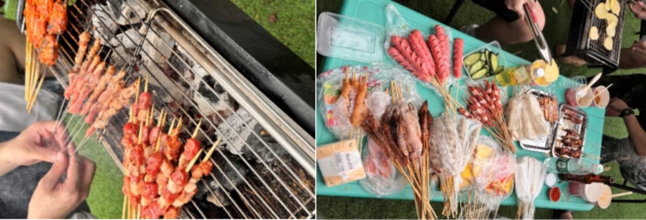 活动开始后,在“男女搭配,干活不累”的分组原则下,同学们协作完成食材准备与烧烤任务。大家分工明确,洗菜的仔细择洗、生火的熟练控温、烹饪的各显身手,烤串的孜然香在营地弥漫。用餐时,黄洪卫老师与同学们围坐一桌,听大家分享对未来职业的规划,解答专业学习的疑惑,偶尔还会说起自己的大学趣事,烟火的暖光里,师生间、同学间的情谊愈发深厚。