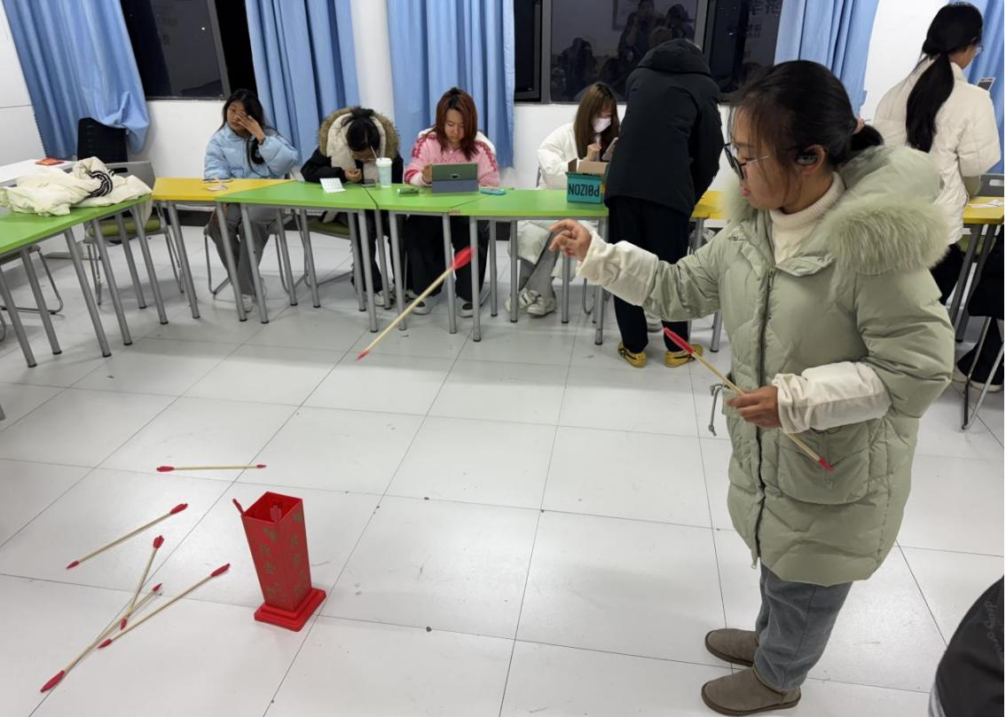 活动以“集印章兑奖品”为核心,设置套圈、投壶、看图猜成语等多个趣味关卡。套圈区里,同学们手持彩圈,瞄准圆锥筒,凝神聚力、精准投掷,欢呼声与惋惜声此起彼伏。